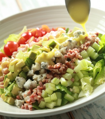 Σε ένα μπολ ρίχνουμε το μαρούλι και το 1/3 της βινεγκρέτ και ανακατεύουμε με απαλές κινήσεις. Αλατίζουμε και σερβίρουμε το μαρούλι σε ένα πιάτο. Βάζουμε τα υπόλοιπα υλικά πάνω στο μαρούλι σε σειρές, το ένα δίπλα από το άλλο. Αλατίζουμε, περιχύνουμε με την υπόλοιπη βινεγκρέτ και σερβίρουμε.